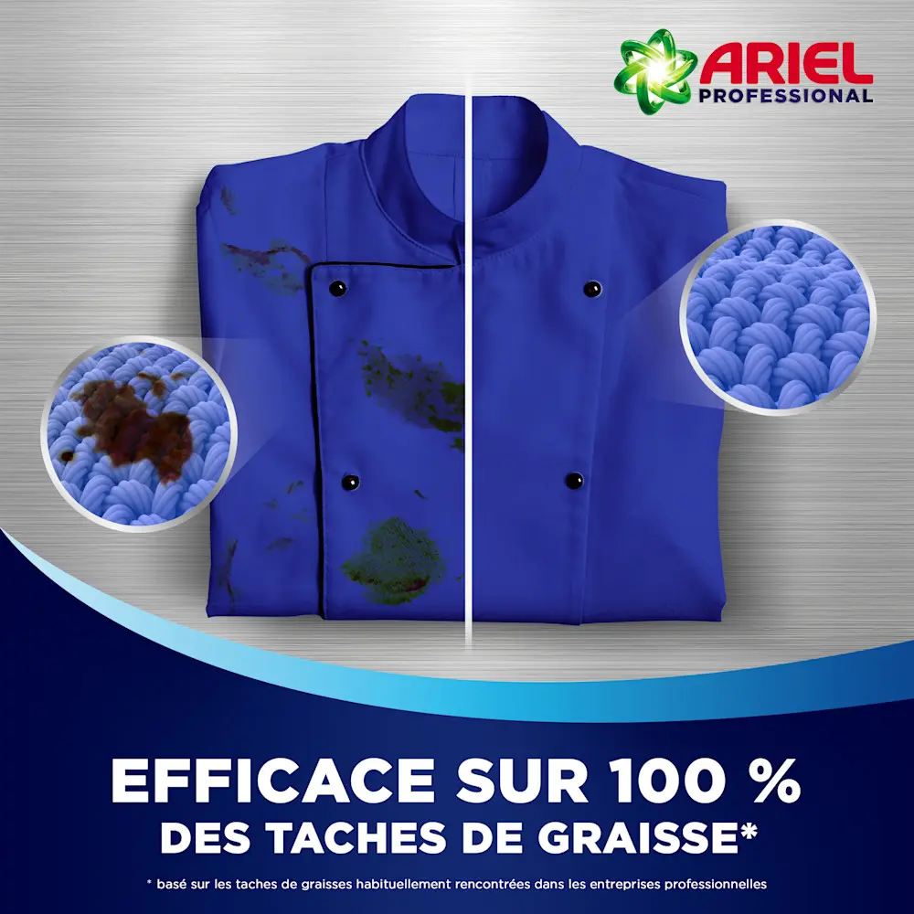 - Les ingrédients très performants présentent un pouvoir détachant remarquable et éliminent les taches professionnelles les plus tenaces